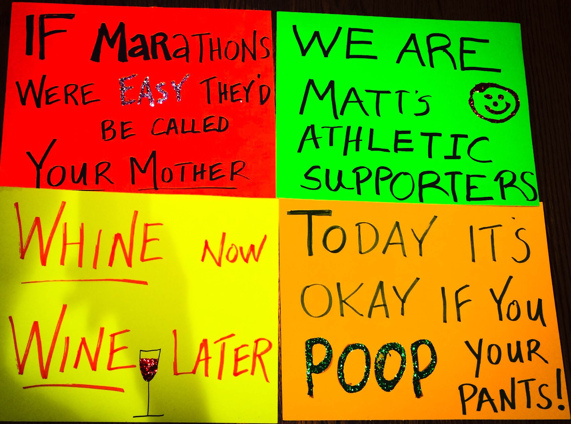 Who wouldn’t keep running to see what signs would be pulled out next? I honestly had the best cheer crew ever. They chased me on bike and in car. Sarah and Patrick made the funniest signs and hustled to three different locations on the marathon route. Two of my favorites: